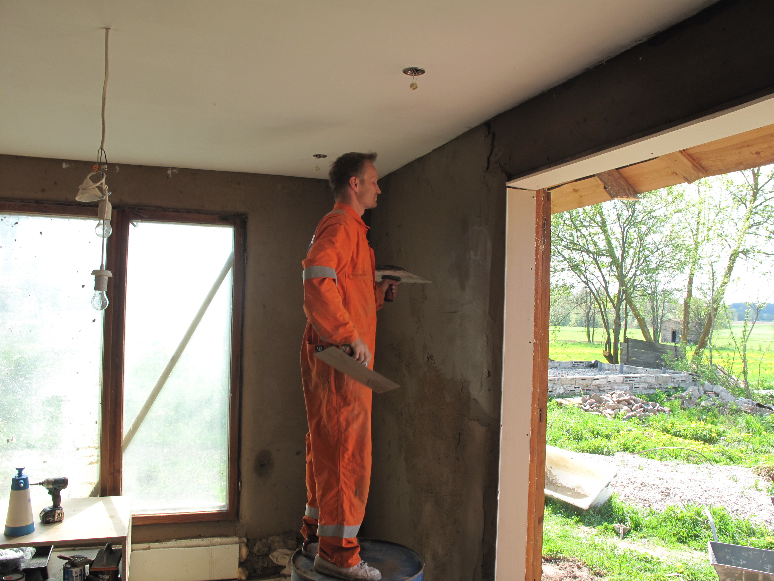 Pracownik spółdzielni socjalnej EKONOVA podczas pracy – tynkowanie za pomocą słomy i gliny
