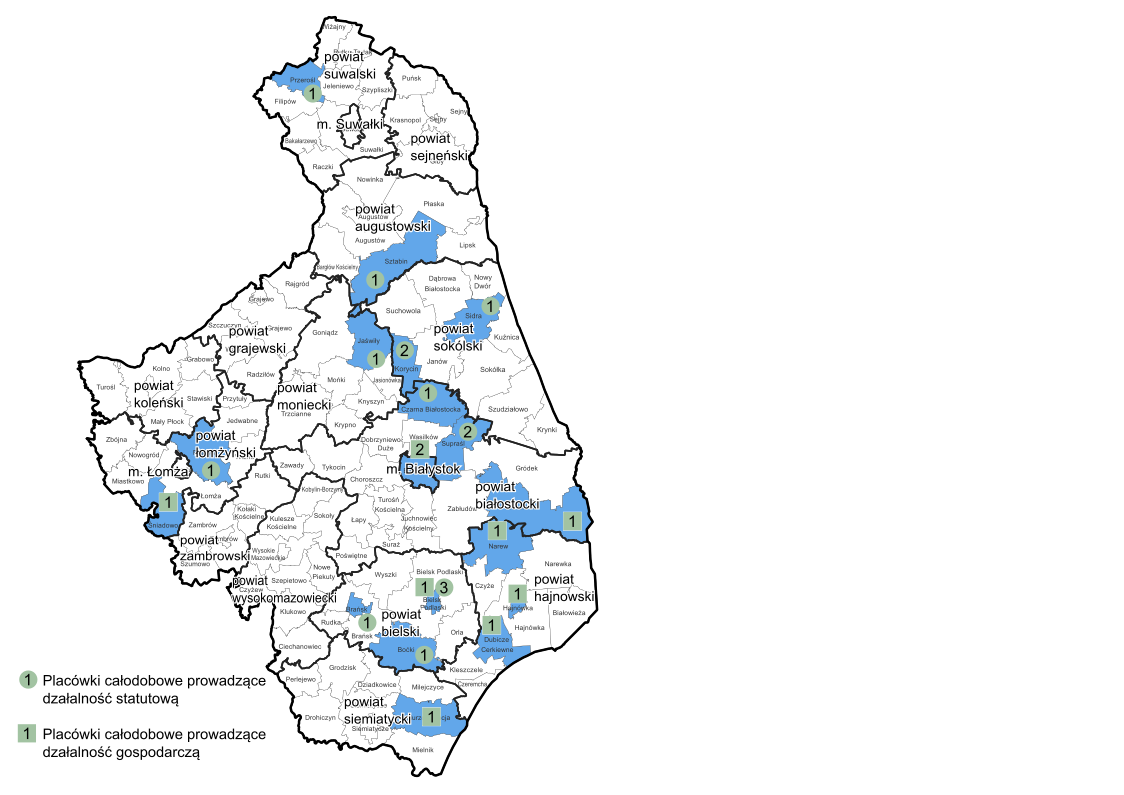 Placówki świadczące przez całą dobę usługi opiekuńcze zapewniające: udzielanie pomocy w podstawowych czynnościach życiowych, pielęgnację, opiekę higieniczną, niezbędną pomoc w załatwianiu spraw osobistych, kontakty z otoczeniem oraz usługi bytowe w zakresie: miejsca pobytu, wyżywienia, utrzymania czystości.