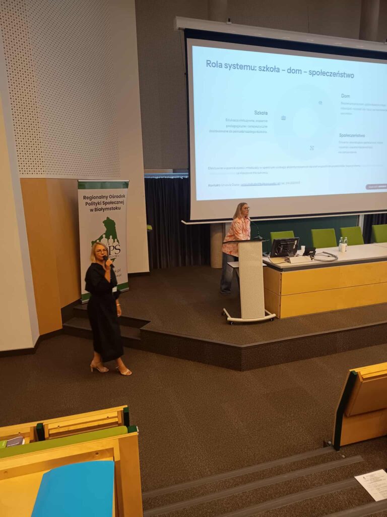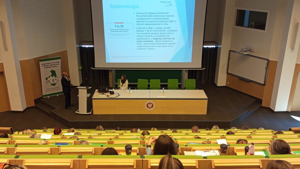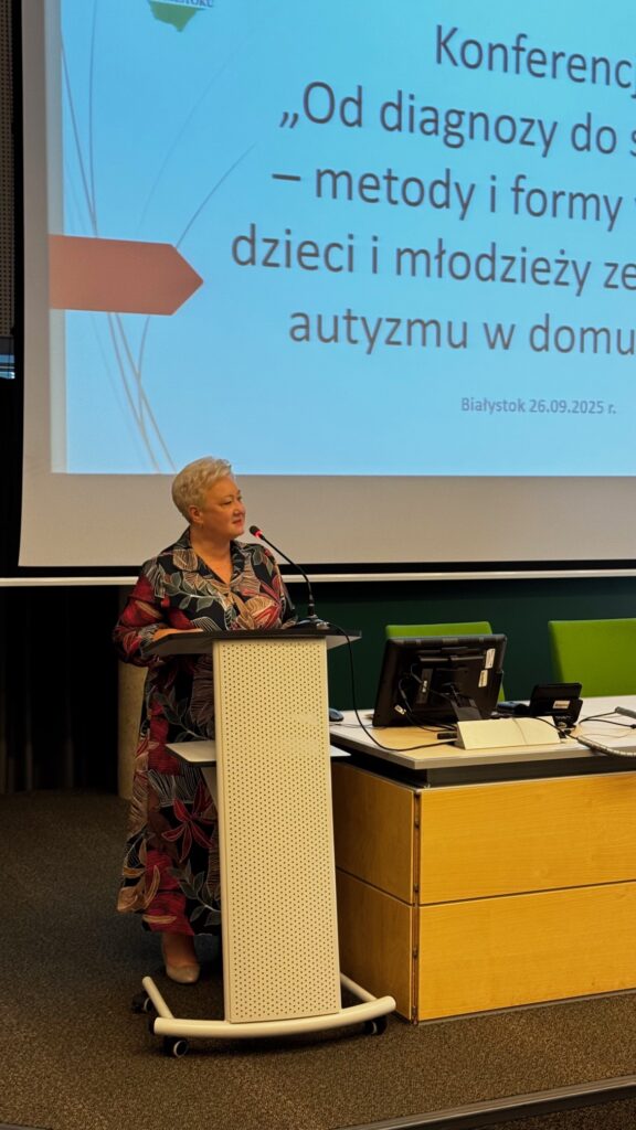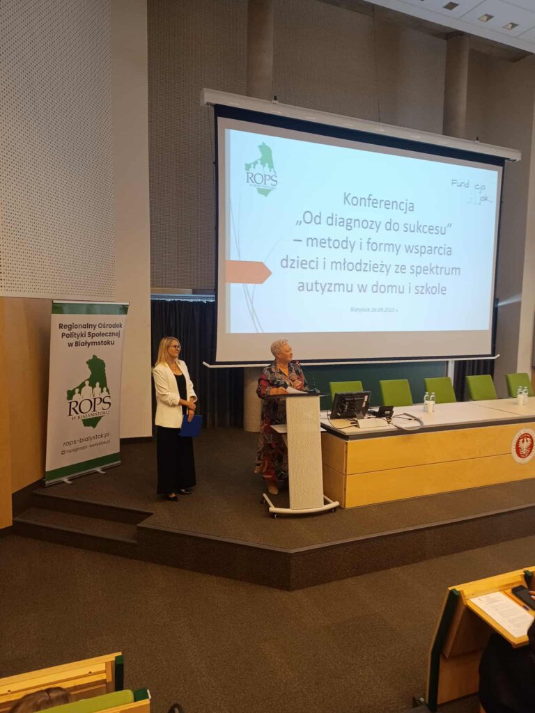 Dnia 26 września 2025 r. Regionalny Ośrodek Polityki Społecznej w Białymstoku przy współpracy merytorycznej z Fundacją na Rzecz Wspierania Osób z Zaburzeniami ze Spektrum Autyzmu i Innymi Niepełnosprawnościami „A jak…”, zorganizował konferencję pn.: „Od diagnozy do sukcesu” – metody i formy wsparcia dzieci i młodzieży ze spektrum autyzmu w domu i szkole, która została skierowana do rodziców i opiekunów, dyrektorów szkół, pedagogów, psychologów, nauczycieli z terenu województwa podlaskiego.
