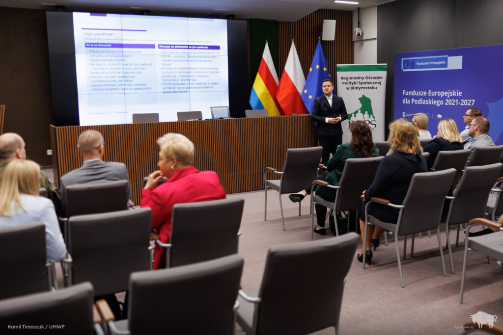 Celem obrad było omówienie w jaki sposób na poziomie krajowym zapewniania jest spójność planów i procedur z KPON ze szczególnym uwzględnieniem art. 11, dotyczącym ostrzegania, ewakuacji, schronienia oraz koordynacji działań służb w zakresie dostępności i ciągłości wsparcia dla osób z niepełnosprawnościami w sytuacjach ryzyka, w tym konfliktu zbrojnego, klęsk żywiołowych oraz innych sytuacji nadzwyczajnych. Odwołano się również do art. 4 ust. 3 KPON (konsultowanie i aktywne włączanie osób z niepełnosprawnościami i reprezentujących je organizacji w procesy decyzyjne), art. 9 (dostępność), art. 19 (niezależne życie i włączenie w społeczeństwo), art. 21 (dostęp do informacji i komunikacji) oraz art. 25 i 28 (ciągłość ochrony zdrowia, wsparcia i warunków życia). Znaczenie problemu zostało osadzone także w danych regionalnych. W materiałach przedstawiono m.in. skalę sieci usług i placówek w województwie podlaskim, w tym ŚDS, DPS, mieszkania wspomagane, centra opiekuńczo-mieszkalne oraz usługi opiekuńcze, wskazując, że planowanie bezpieczeństwa musi uwzględniać realną mapę wsparcia, a nie jedynie formalne struktury.