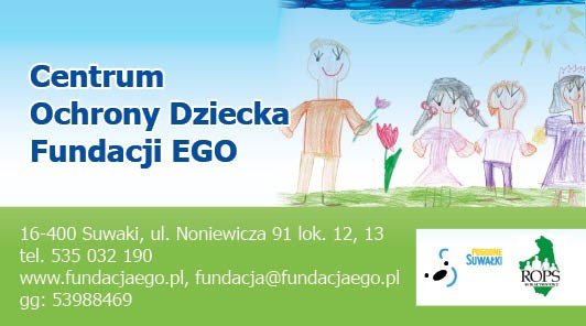 Fundacja EGO w styczniu br. utworzyła Centrum Ochrony Dziecka Fundacji EGO, mieszczące się w Suwałkach, przy ul. Noniewicza 91. Głównym celem działania Centrum jest pomoc dzieciom krzywdzonym – doświadczającym przemocy fizycznej, emocjonalnej a przede wszystkim seksualnej. Specjaliści oferują diagnozę oraz terapię dzieci i młodzieży, jak również wsparcie i edukację dla rodziców i opiekunów. Kontakt z psychologami Centrum możliwy jest również za pośrednictwem komunikatora gg 53988469. Centrum Ochrony Dziecka powstało dzięki dotacji Urzędu Miejskiego w Suwałkach oraz Regionalnego Ośrodka Polityki Społecznej w Białymstoku. Fundacja EGO prowadzi również Poradnię Rodzinną, w której bezpłatną pomoc uzyskają osoby znajdujące się w sytuacji kryzysowej.